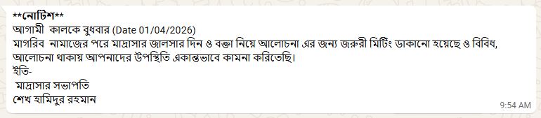 আগামী কালকে বুধবার (Date 01/04/2026) মাগরিব নামাজের পরে মাদ্রাসার জালসার দিন ও বক্তা নিয়ে আলোচনা এর জন্য জরুরী মিটিং ডাকানো হয়েছে ও বিবিধ, আলোচনা থাকায় আপনাদের উপস্থিতি একান্তভাবে কামনা করিতেছি। ইতি- মাদ্রাসার সভাপতি শেখ হামিদুর রহমান
